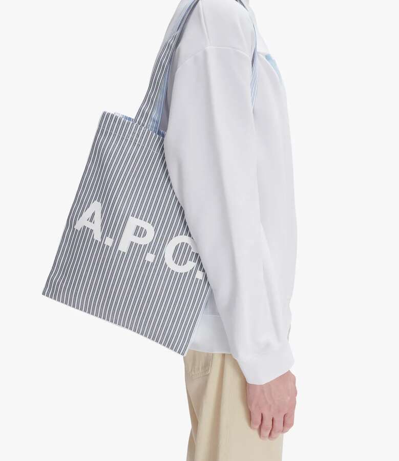 A.P.C. Tragetasche Lou mit Streifenmuster in Ecru und Blau aus Bio-Baumwolle. Unisex-Modell.