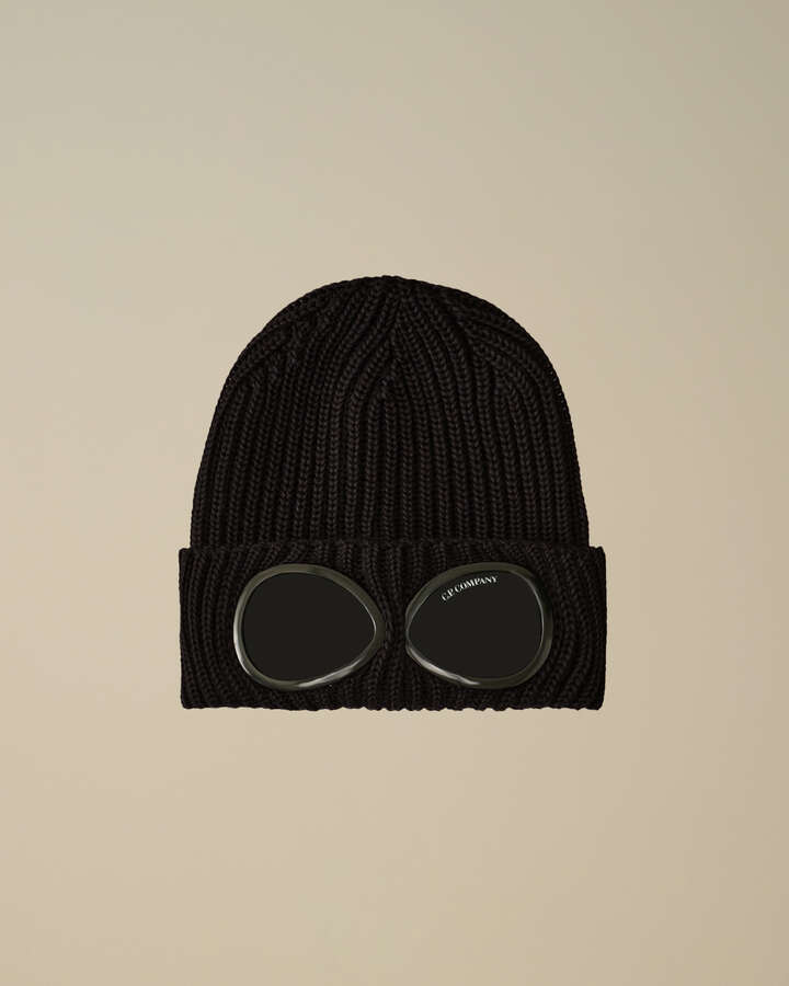 Beanie aus extrafeiner Merinowolle in schwarz mit Goggle-Gläser von C.P. Company.