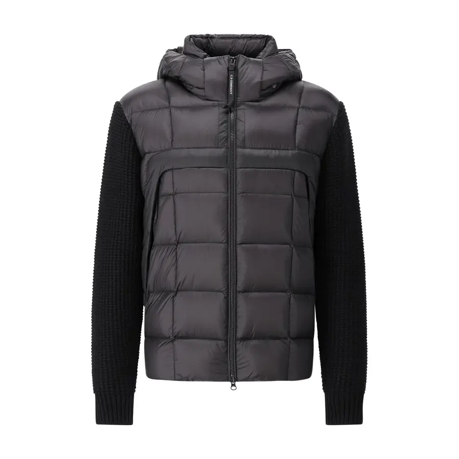 C.P. Company Steppjacke in schwarz mit Strickeinsätzen aus weicher Wolle, großen Seitentaschen, Zwei-Wege-Reißverschluss, abnehmbarer Kapuze und integrierter Sonnenbrille.